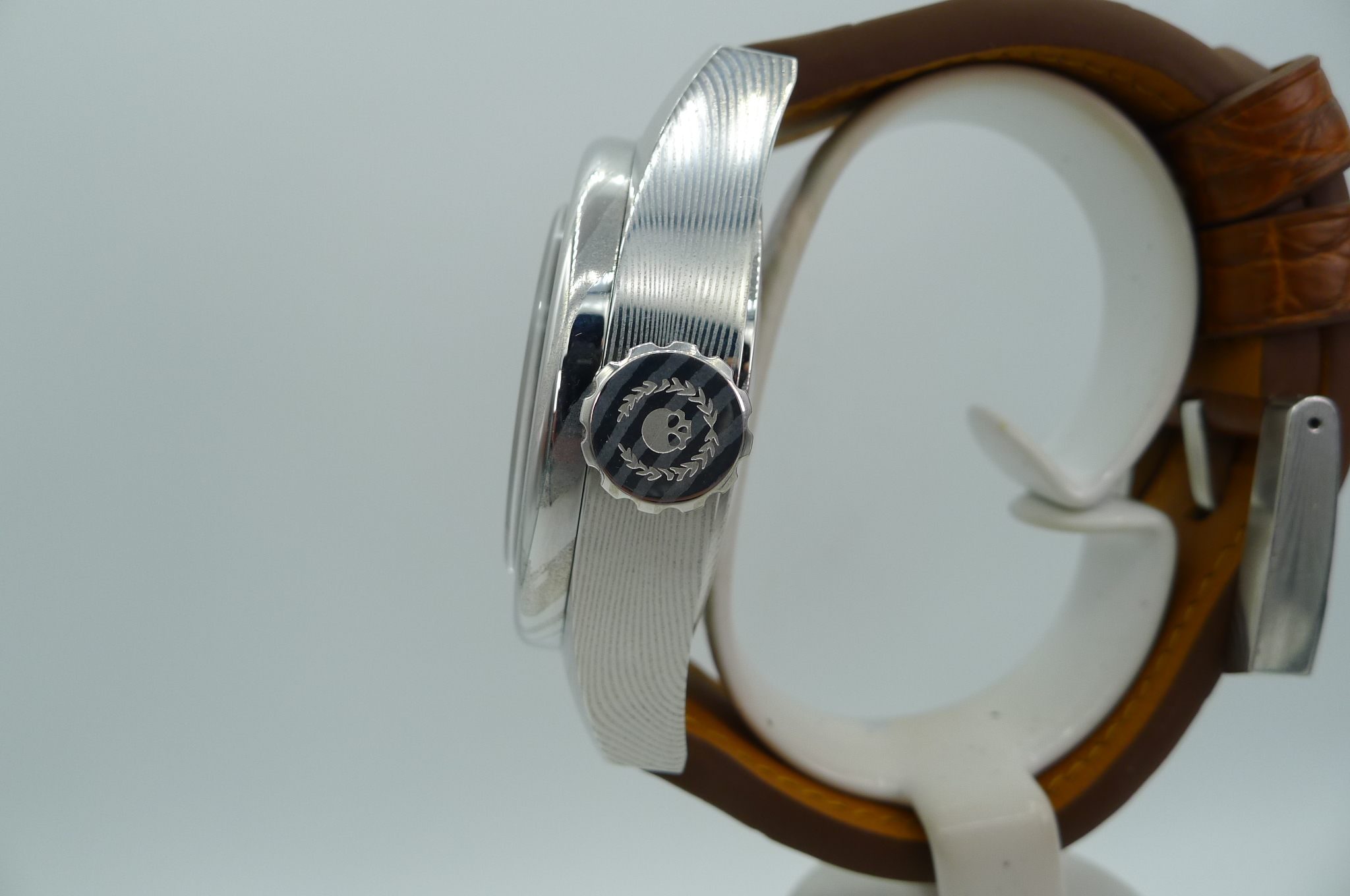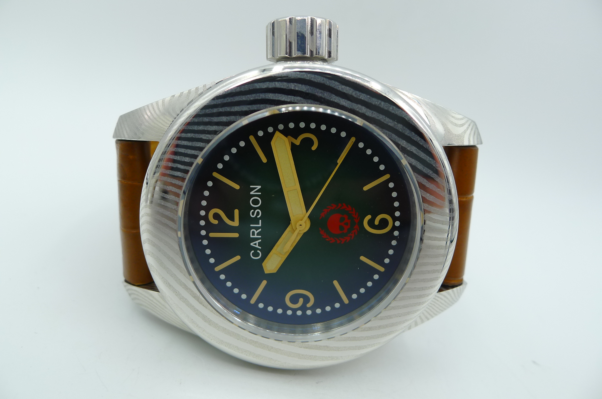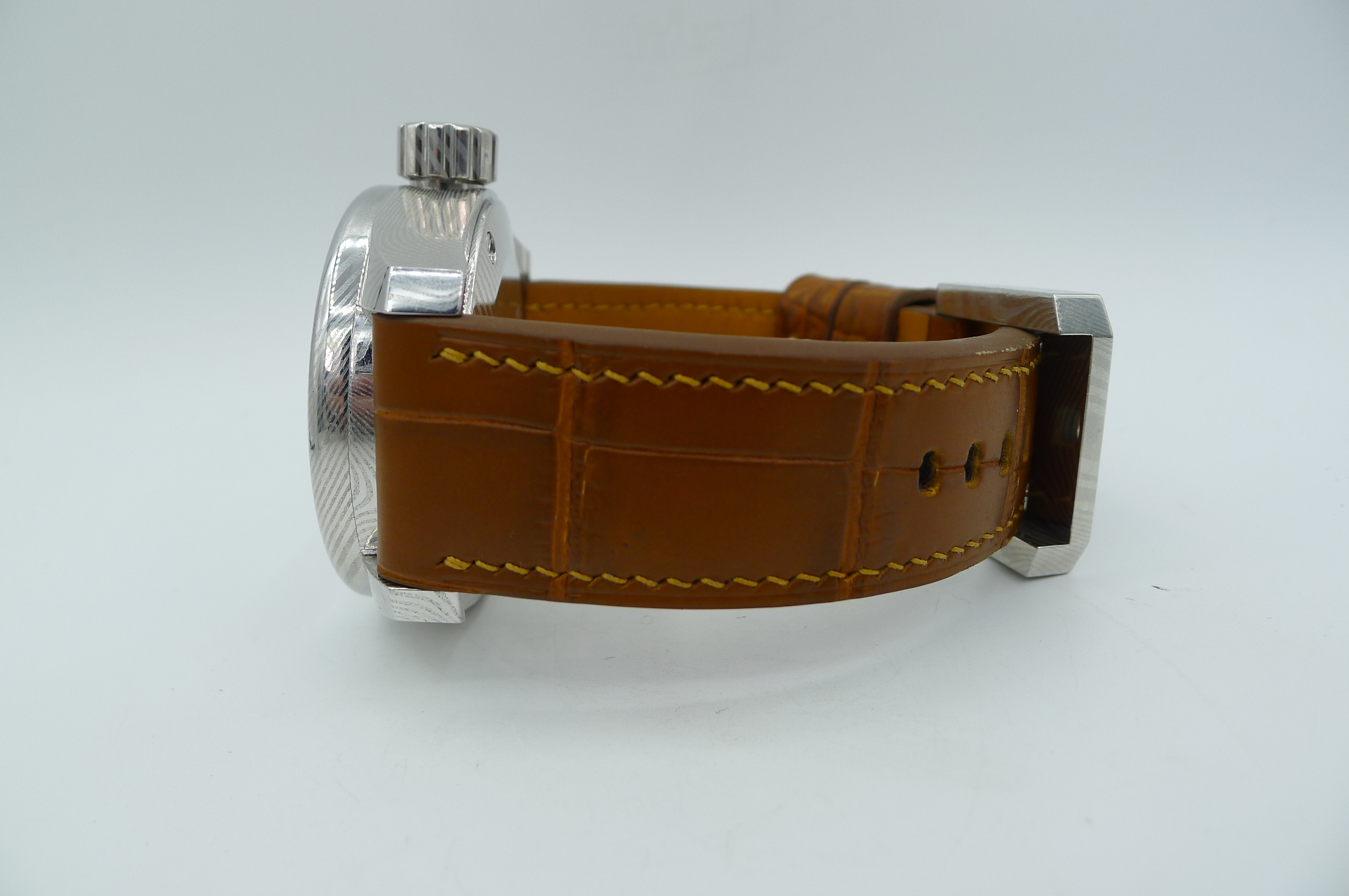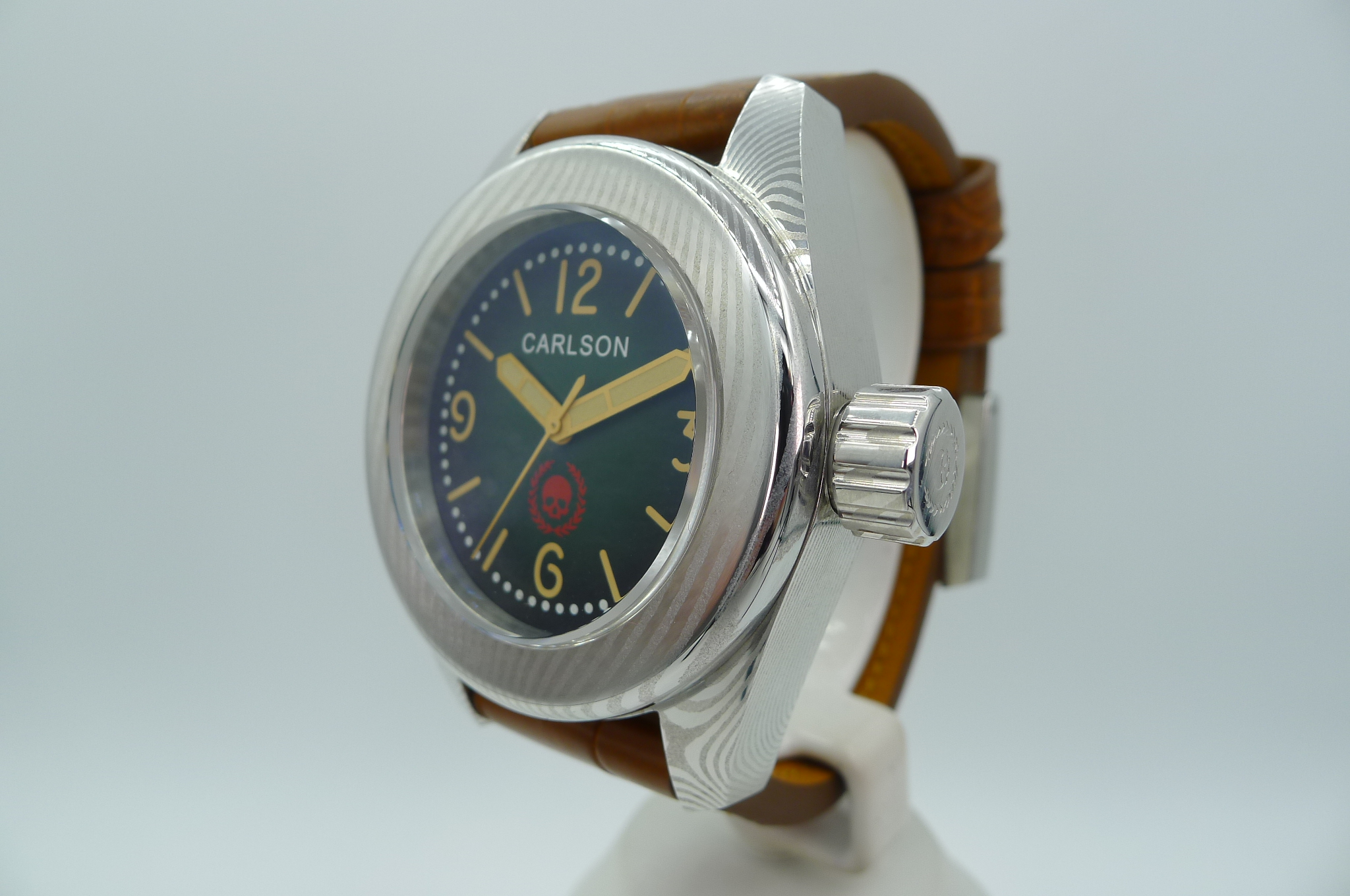 STRAP – CUSTOM HANDMADE HAVANA ALLIGATOR WITH DAMASCUS STEEL TANG BUCKLE. CARLSON RUBBER STRAP MAY BE SUBSTITUTED IF DESIRED IN YOUR CHOICE OF COLORS – BLACK, GRAY, KHAKI GREEN, RED OR OFF WHITE WITH POLISHED STEEL SKULL BUCKLE