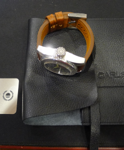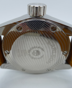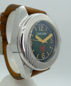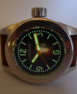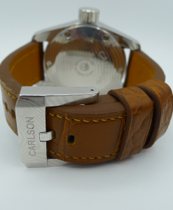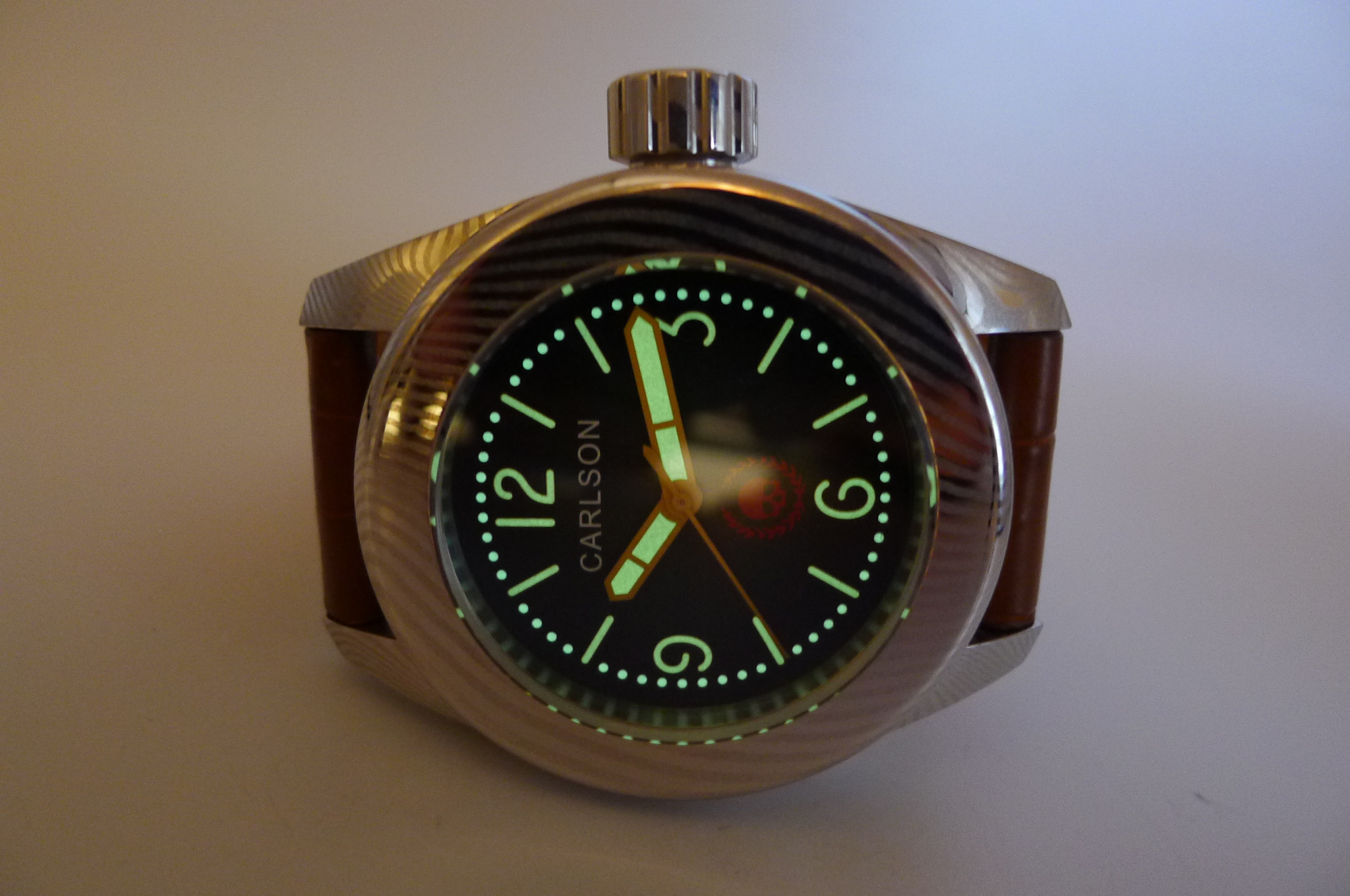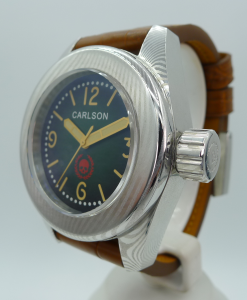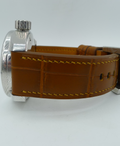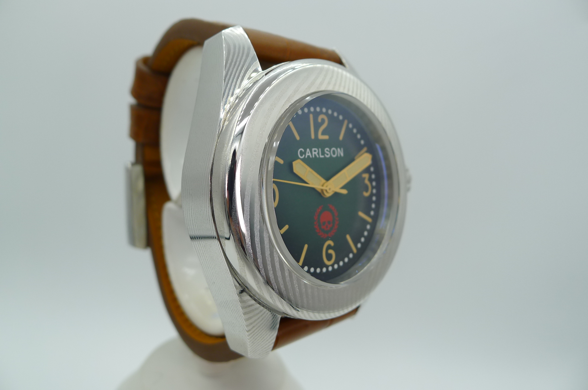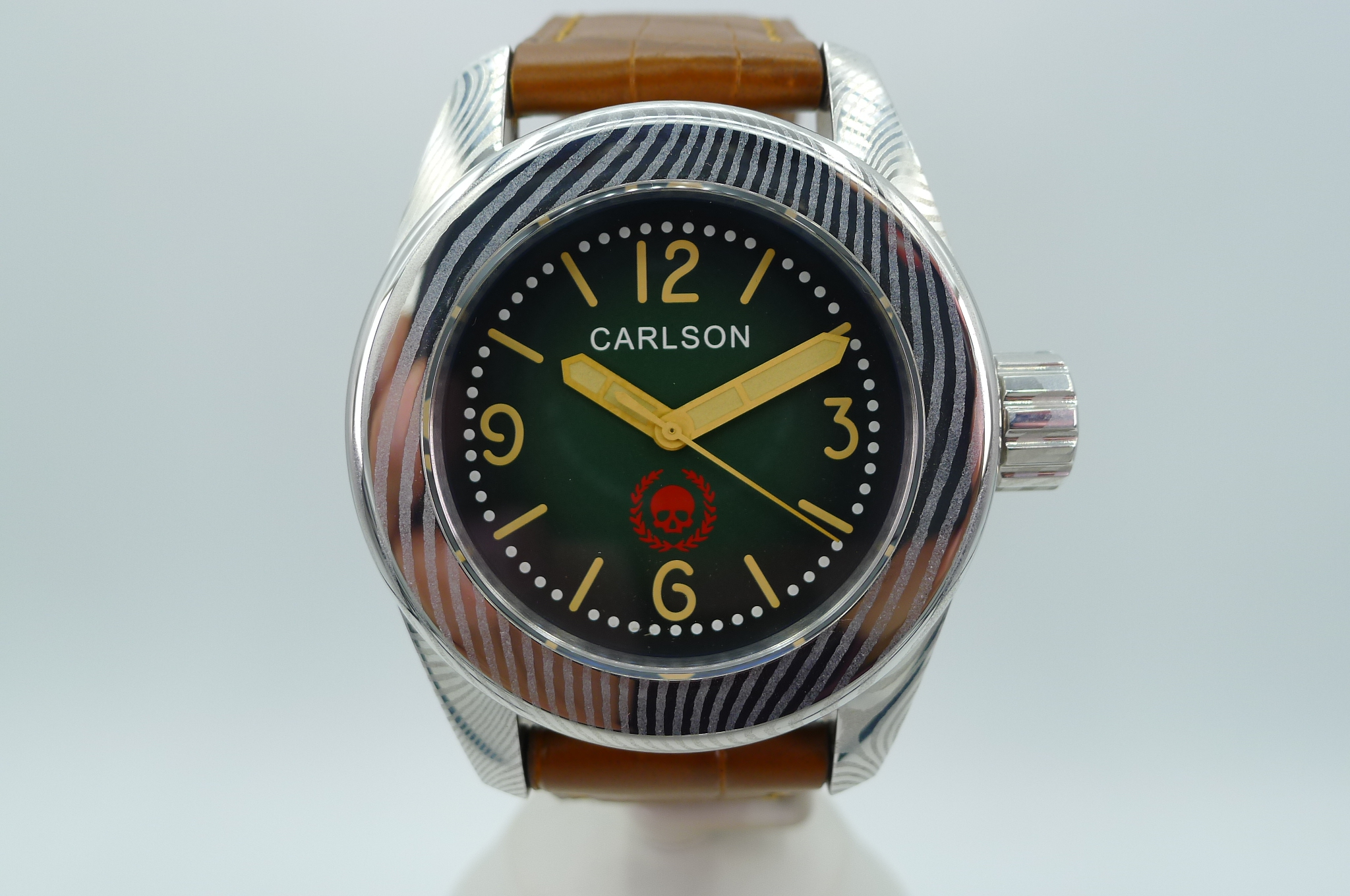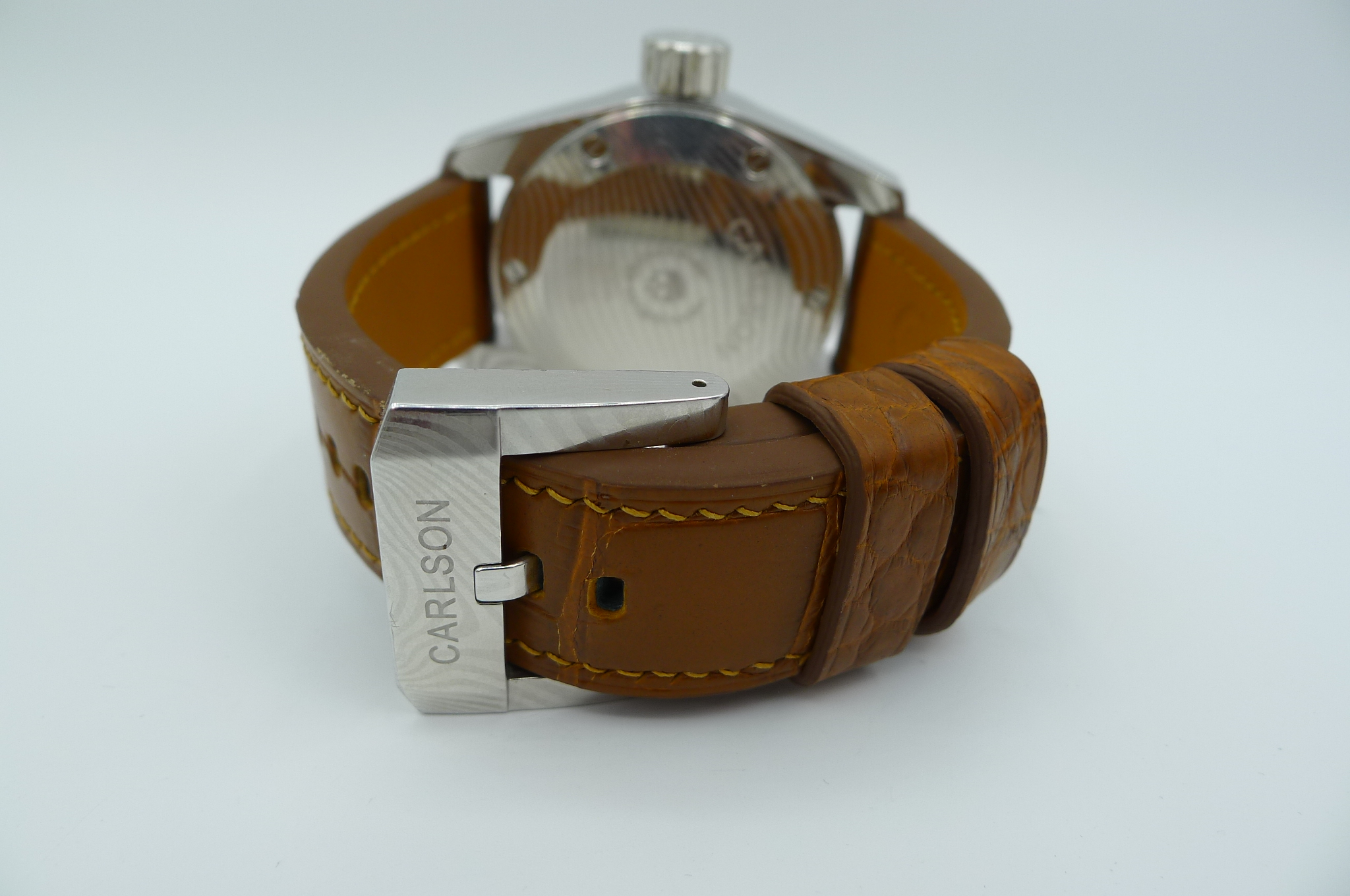 STRAP – CUSTOM HANDMADE HAVANA ALLIGATOR WITH DAMASCUS STEEL TANG BUCKLE. CARLSON RUBBER STRAP MAY BE SUBSTITUTED IF DESIRED IN YOUR CHOICE OF COLORS – BLACK, GRAY, KHAKI GREEN, RED OR OFF WHITE WITH POLISHED STEEL SKULL BUCKLE
